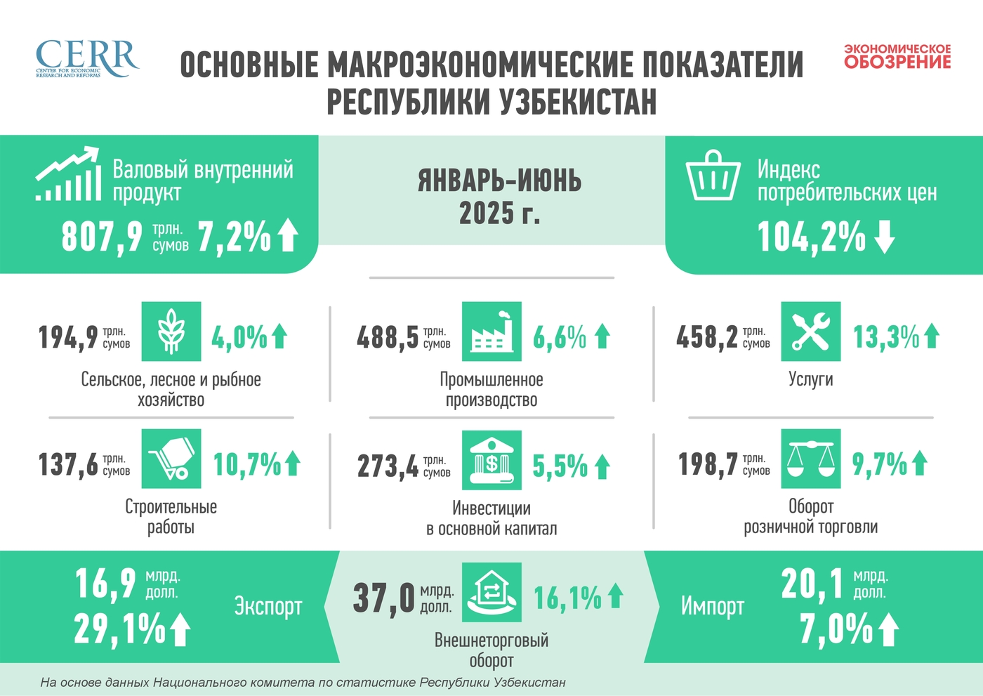В целом, в первом полугодии 2025 года экономика Узбекистана демонстрирует уверенное восстановление и структурную устойчивость. Активная инвестиционная и внешнеэкономическая политика, поддержка реального сектора и снижение инфляционного давления обеспечивают позитивную макроэкономическую динамику.