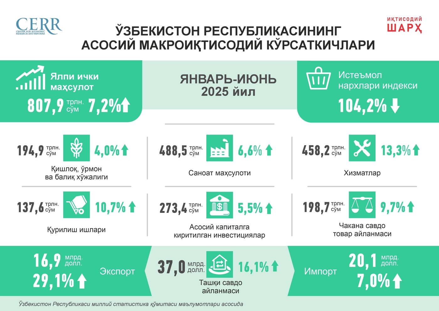 2025 йилнинг биринчи ярим йиллиги якунлари бўйича Ўзбекистон иқтисодиёти жадал ўсиш динамикасини сақлаб қолмоқда.