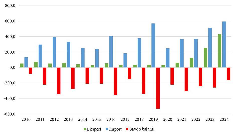 - alyumin va undan tayyorlangan buyumlar (TIF TN 76) eksporti 2020-yilda deyarli eksport qilinmagan bo‘lsa, 2024-yilda eksport hajmi 11.4 million AQSH dollariga yetdi;