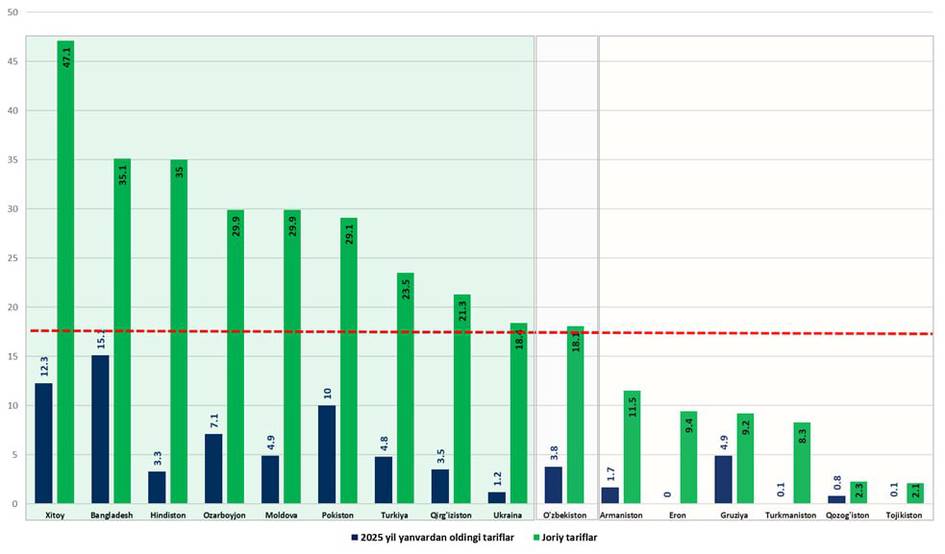 Ushbu sharoitda O‘zbekiston bazaviy toifadagi davlat sifatida AQSHning o‘rtacha tarif stavkasining keskin oshishiga duch keldi. Bunda, AQSHning O‘zbekistondan importi uchun o‘rtacha tarif stavkasi 2024-yildagi 3,8 foizdan 2025-yilda 18,1 foizga ko‘tarildi. Ayniqsa, yoqilg‘i va kon mahsulotlari (29,5 foiz) hamda ishlab chiqarish sektori (14,5 foiz) bo‘yicha tariflarning sezilarli oshishi o‘zbekistonlik eksportyorlar uchun bozorga kirishni qiyinlashtirib, past marjali mahsulotlar eksporti raqobatbardoshligini pasaytirishi mumkin.